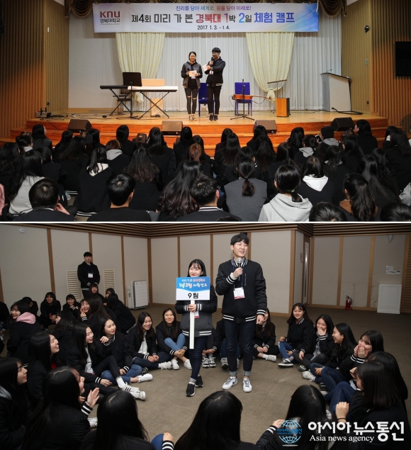 경북대 대구캠퍼스에서 '미리 가 본 경북대학교 1박 2일 체험캠프'가 열리고 있다.(사진제공=경북대) 경북대학교가 겨울방학에 전국 고교생 대상으로 대학 캠퍼스 내 생활관에서 합숙하며, 대학 생활을 미리 체험하는 '미리 가 본 경북대학교 1박 2일 체험캠프'를 실시했다. 이... 2017-01-04