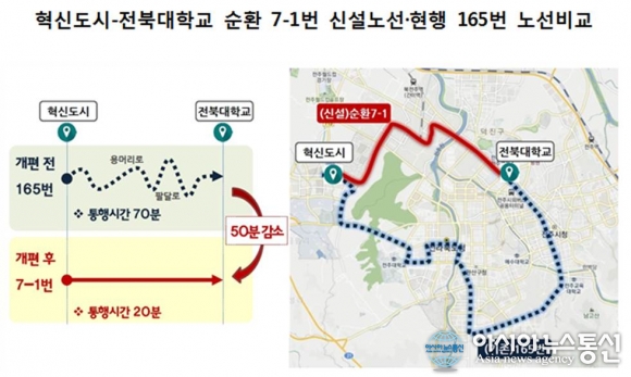 혁신도시-전북대학교 순환 7-1번 신설노선·현행 165번 노선비교./아시아뉴스통신=문성주 기자 전북혁신도시에 거주하는 전북대 학생들은 오는 3월 신학기부터 신설노선인 7-1번 버스를 이용할 경우 통학시간이 기존보다 50분 가량 단축된다. 이는 전주·완주 시내버스가 60년만의 ... 2017-01-04