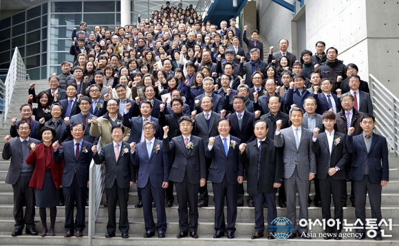 4일 배재대학교가 신년교례회를 펼친 뒤 참석자들이 기념촬영을 하고 있다.(사진제공=배재대학교) 배재대학교가 4일 대학 국제교류관 아트컨벤션홀에서 신년교례회를 가졌다. 이날 신년교례회에는 김영호 총장을 비롯해 곽명근 학교법인 배재학당 이사장, 박병석 더불어민주당 국회의... 2017-01-04