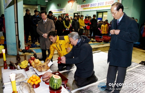 4일 오전 6시 경남 하동군 윤상기 군수가 수협 위판장에서 열린 2017년 초매식에 참석해 무사 안녕을 기원하고 있다.(사진제공=하동군청) 경남 하동군수협이 4일 오전 6시 수협 위판장에서 윤상기 군수, 손영길 군의회 의장과 지역 군의원, 전이언 수협장, 어업인 등 100여명이 참석한 가운데 새... 2017-01-04
