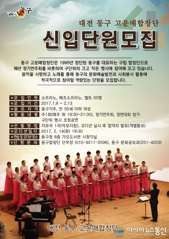 동구 고운매합창단 단원 모집 포스터.(사진제공=대전 동구청) 대전 동구(구청장 한현택)가 지역 문화 발전을 이끌 동구 고운매합창단 신입단원을 오는 9일부터 다음달 13일까지 모집한다. 참가 자격은 동구에 주소를 둔 만 55세 이하 열정 있는 여성이면 누구나 신청이 가능하다. 모집분... 2017-01-04