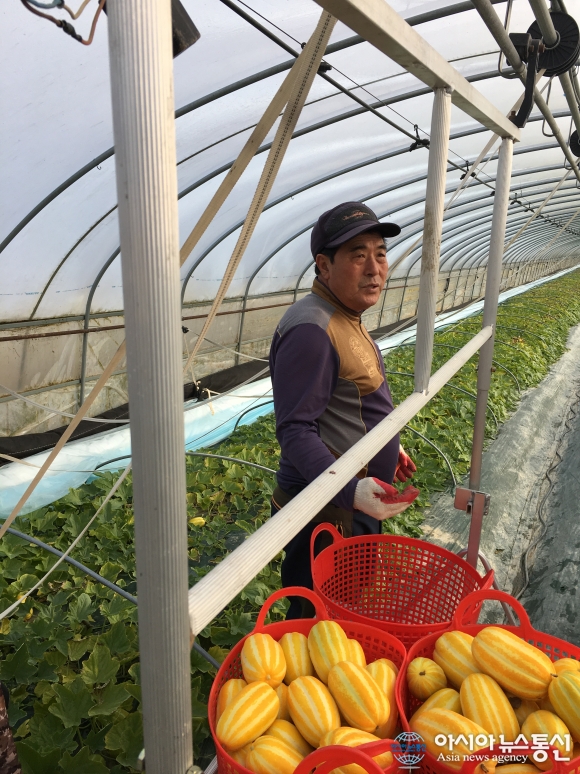 4일 고령군 덕곡면 반성리에서 참외농사를 짓는 권태봉씨(63)가 참외를 수확하고 있다.(사진제공=고령군청) 최고의 맛과 품질을 자랑하는 '고령참외'가 경북 고령군 덕곡면에서 4일 첫 출하됐다. 덕곡면 반성리에서 참외농사를 짓는 권태봉씨(63)는 이날 참외 90박스(5kg)를 수확, 서울 ... 2017-01-04