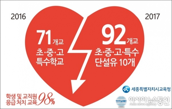 세종시교육청이 지난해 71개교에 자동제세동기를 보급한데 이어 올해에도 11개 신설학교와 10개 단설유치원에 보급한다.(사진제공=세종시교육청) 세종시교육청이 4일 학교 응급상황에 신속히 대처하기 위해 자동제세동기(AED Automated External Defibrillator)를 단설유치원에도 보급한다고 밝혔다. ... 2017-01-04