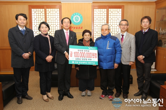 김종효, 정정엽씨 부부 경상대 발전기금 기탁 모습.(사진제공=경상대) 국립 경상대학교(GNUㆍ총장 이상경)는 함양군 휴천면에 거주하고 있는 김종효(77), 정정엽씨(74) 부부가 대학발전기금 1억원을 출연했다고 밝혔다. 발전기금 전달식은 4일 오후 2시 대학본부 3층 접견실에서 마련됐다. ... 2017-01-04