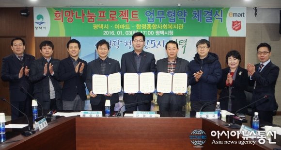 3일 경기 평택시(시장 공재광)와 이마트 평택점(점장 배상덕), 합정종합사회복지관 (관장 김동국)은 관내 소외된 불우이웃을 후원하기 위한 ‘희망나눔프로젝트’업무협약식을 체결했다.(사진 왼쪽 다섯번째 공재광 평택시장).(사진제공=평택시장) 경기 평택시(시장 공재광)와 이마트 ... 2017-01-03