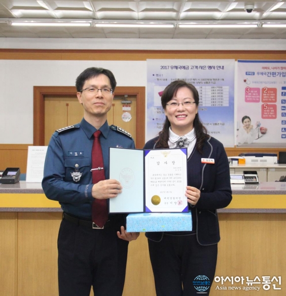 3일 이양호 경북 예천경찰서장(왼쪽)이 보이스피싱 피해를 막은 예천우체국 김은미씨에게 감사장을 전달하고 있다.(사진제공=예천경찰서) 경북 예천경찰서(서장 이양호)는 3일 보이스피싱 피해를 막은 예천우체국 김은미씨에게 감사장을 전달했다. 김은미씨는 지난해 12월30일 예천우체국... 2017-01-03