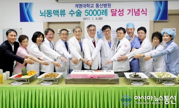 3일 계명대 동산병원 수술센터에서 김권배 동산의료원장, 권중혁 동산병원장 등 관계자 50여명이 참석한 가운데 '뇌동맥류 수술 5000례 달성 기념식'을 갖고 있다.(사진제공=계명대 동산병원) 계명대 동산병원이 뇌동맥류 수술 5000례를 넘어섰다. 3일 계명대 동산병원에 따르면 신경외... 2017-01-03