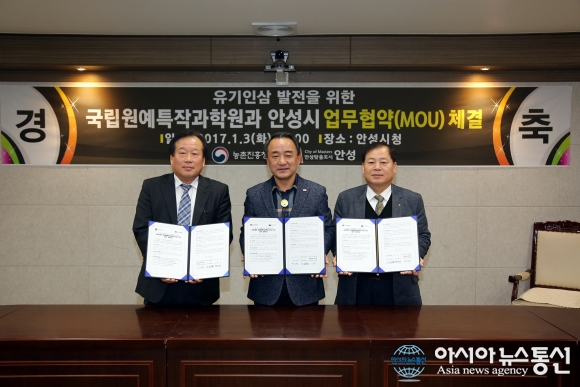3일 오전 경기 안성시(시장 황은성)는 시청에서 농촌진흥청 국립원예특작과학원과 ‘인삼 유기재배 연구 협력을 통한 유기인삼 재배 확대 및 산업 활성화’ 협약식을 체결했다.(사진 중앙 황은성 안성시장).(사진제공=안성시청) 농촌진흥청 국립원예특작과학원과 경기 안성시(시장 황... 2017-01-03
