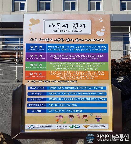 아동권리 게시판.(사진제공=오산시청) 경기 오산시(시장 곽상욱)는 지역사회 아동권리 인식 확대를 위해 관내 주민센터 등 6개소에 '아동권리 홍보게시판'(우리 아이들의 소중한 권리, 함께 지켜주세요!)을 설치했다. 게시판에는 유엔아동권리협약에서 규정하는 아동의 생존, 보호, ... 2017-01-03