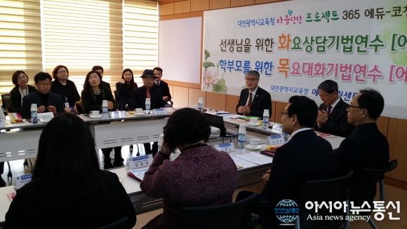 3일 이영 교육부 차관(오른쪽)이 대전 에듀힐링센터에서 현장의 애로사항과 의견을 청취하고 있다.(사진제공=대전시교육청) 이영 교육부 차관과 교육부 관계자가 3일 대전 에듀힐링센터를 현장 방문했다. 이날 현장 방문은 2017년 교원치유지원센터 전국 확대를 앞두고 교육부 차원에서 ... 2017-01-03
