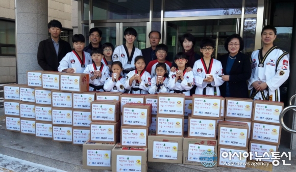지난해 12월 29일 유-에스태권도장(관장 허은행)이 공주시를 방문해 태권도장 학생들이 라면트리 이벤트를 진행하고 모은 라면 선물 55박스를 기부하며 기념촬영을 하고 있다.(사진제공=공주시청) 공주시(시장 오시덕)에 어려운 이웃들을 위한 성금 기부가 이어져 훈훈함을 더하고 있다. ... 2017-01-03