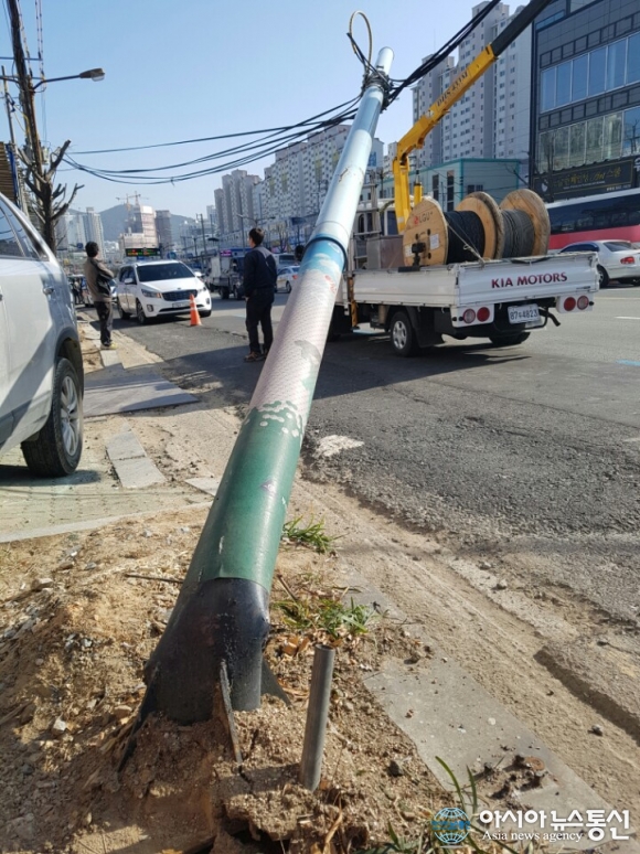 3일 오후 1시쯤 부산 동래한전 인근 한 신경외과 앞을 지나던 대형트럭의 짐칸에 실린 고철이 전신주 줄에 걸려 전신주가 뽑혀 쓰러져 있다./아시아뉴스통신=박상언 기자 3일 오후 1시쯤 부산 동래구 안락동 한국전력 인근 한 신경외과 앞을 지나던 대형트럭이 전신주 줄을 건드려 전신주가 ... 2017-01-03