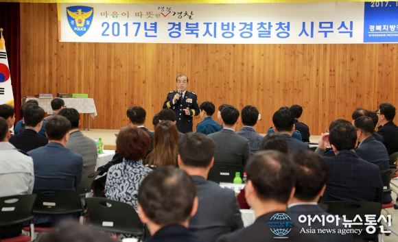 2일 오전 경북경찰청 5층 대회의실에서 청장, 1.2부장, 과장 등 직원 150여명이 참석한 가운데 2017년 시무식이 열리고 있다.(사진제공=경북경찰청) "마음이 따뜻한 경북경찰이 되겠습니다." 경북경찰청(청장 박화진)은 2일 오전 5층 대회의실에서 청장, 1.2부장, 과장 등 직원 150여명이 ... 2017-01-02
