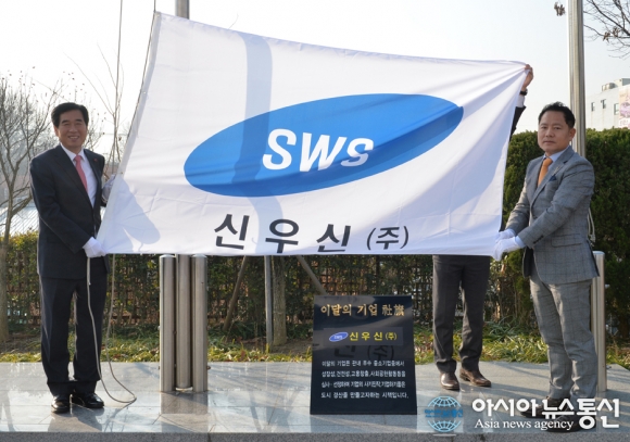 2일 경산시청 국기게양대 앞에서 최영조 시장(왼쪽)과 이지우 신우신㈜ 대표이사(오른쪽)가 회사기 게양식을 갖고 있다.(사진제공=경산시청) 경북 경산시는 1월 이달의 기업으로 신우신㈜를 선정하고, 최영조 시장과 이지우 대표이사 등 80여명이 참석한 가운데 2일 시청 국기게양대 앞에서 ... 2017-01-02