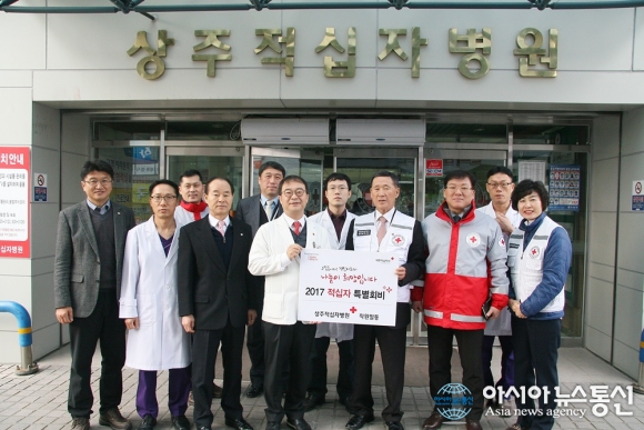 2일 이상수 경북 상주 적십자 병원장이 대한적십자사 경북지사에 특별회비를 전달하고 있다.(사진제공=상주적십자병원) 경북 상주 적십자병원(원장 이상수)은 2일 대한적십자사 경북지사(회장 강보영) 직원들과 함께 새해를 맞아 '떡국 나눔' 봉사활동을 가졌다. 이날 행사는 지... 2017-01-02