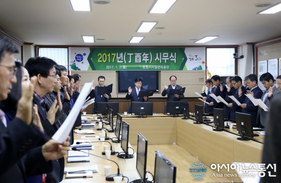 2일 오전 경남 창원시설공단 상황실에서 ‘2017년 시무식’이 열린 가운데 조청래 이사장을 비롯한 임원과 간부직원들이 ‘반부패?청렴 서약식’을 갖고 새해 결의를 다지고 있다.(사진제공=창원시설공단) 경남 창원시설공단(이사장 조청래)은 2일 오전 공단 상황실에서 임원과 ... 2017-01-02