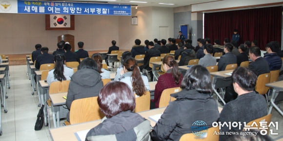 2일 대전서부경찰서가 경찰서 대회의실에서 전 직원이 참석한 가운데 새해 희망찬 출발을 위한 시무식을 열고 있다.(사진제공=대전서부경찰서) 대전서부경찰서(서장 이동주)가 2일 경찰서 대회의실에서 전 직원이 참석한 가운데 새해 희망찬 출발을 위한 시무식을 열었다. 이날 시무식은 ... 2017-01-02