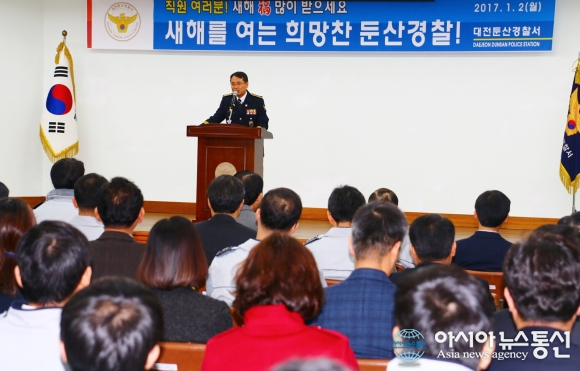 2일 대전둔산경찰서가 5층 대회의실에서 전 직원이 참석한 가운데 시무식 행사를 열고 있다.(사진제공=대전둔산경찰서) 대전둔산경찰서(서장 심은석)가 2일 경찰서 대회의실에서 전 직원이 참석한 가운데 시무식 행사를 열었다. 이날 시무식은 경찰헌장 낭독, 신년 영상 시청, 경찰서장 신... 2017-01-02