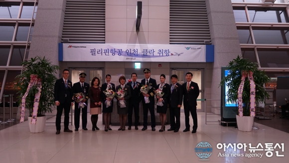 1일 오후 인천공항에서 필리핀항공의 인천-클라크 노선 취항을 축하하며 장은석 필리핀항공 한국지사장(사진 왼쪽에서 1번째), 김광일 필리핀항공 인천공항지점장(사진 오른쪽에서 1번째) 등 필리핀항공 관계자들이 기념행사를 열고 사진촬영을 하고 있다.(사진제공=국제공항) 인천국제공... 2017-01-02