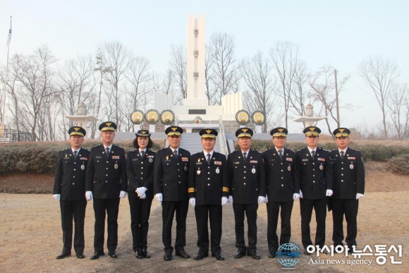 2일 김상렬 안동경찰서장과 간부 직원들이 충혼탑을 찾아 순국선열과 전몰경찰관에 대한 헌화와 묵념을 하고 있다.(사진제공=안동경찰서) 경북 안동경찰서(서장 김상렬)는 2일 학가마루에서 각 과장 및 직원 100여명이 참석한 가운데 정유년 한해를 시작하는 시무식을 개최했다. 시무식 행... 2017-01-02