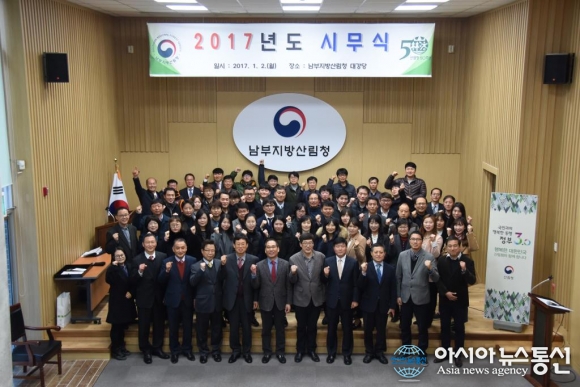2일 남부지방산림청은 전 직원이 참석한 가운데 2017 시무식을 열고 있다.(사진제공=남부지방산림청) 남부지방산림청(청장 남송희)은 2일 대강당에서 전 직원이 참석한 가운데 '2017년 시무식'을 개최했다. 이날 행사에는 지난해 산림행정 발전에 기여한 직원들에게 표창을 수여하고, ... 2017-01-02