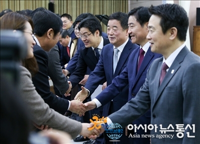 2일 오전 경기도청 신관 제1회의실에서 열린 '2017년도 시무식'에서 남경필 경기도지사(오른쪽 첫번째)와 이재율 행정1부지사, 강득구 연정부지사, 실국장들이 도청 직원들의 손을 잡으며 신년 인사를 하고 있다.(사진제공=경기도청) 2017-01-02