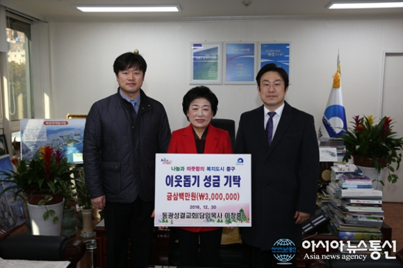 동광성결교회 이창훈 담임목사가 지난 30일 부산 중구에 이웃돕기 성금 300만원을 기탁하고 김은숙 구청장과 기념촬영을 하고 있다.(사진제공=중구청) 2017-01-02