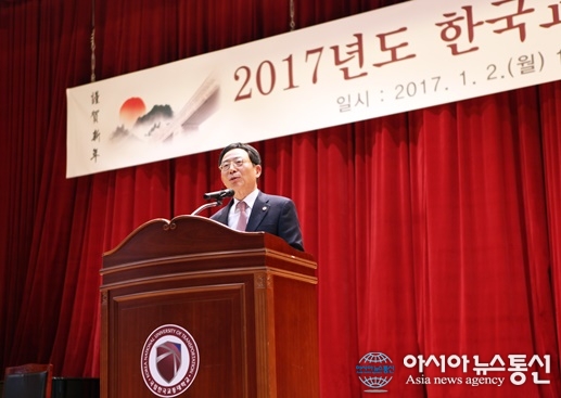 2일 국립 한국교통대학교가 충북 충주캠퍼스에서 ‘2017년 시무식’을 개최한 가운데 김영호 교통대학교 총장이 신년사를 하고 있다.(사진제공=한국교통대) 국립 한국교통대학교(총장 김영호)가 2일 충주캠퍼스 대학본부 2층 국제회의장에서 ‘2017년 시무식’을 개최했다. 시... 2017-01-02