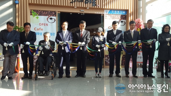 2일 전남도교육청 1층에 문을 연 전남 장애학생 직업체험 카페 1호 '꿈꾸는 작은 숲' 개점식에서 장만채 교육감(왼쪽 다섯번째) 등 관계자들이 테이프를 커팅하고 있다./아시아뉴스통신=고정언기자 전남도교육청(교육감 장만채)은 2일 본청 1층 갤러리 이음에서 장애학생 고용 및 직업... 2017-01-02