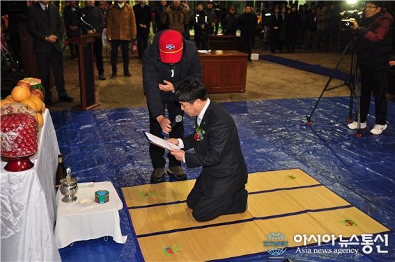 2일 열린 목포수협 초매식에서 김청룡 조합장이 축원문을 낭독하고 있다.(사진제공=목포수협) 전남 목포수산업협동조합(조합장 김청룡)은 2일 선어 및 새우젓 위판 초매식을 가졌다. 이날 행사에는 박홍률 목포시장, 최기동 시의원, 목포수협 임원과 대의원, 어촌계장등이 참석한 가운데 ... 2017-01-02