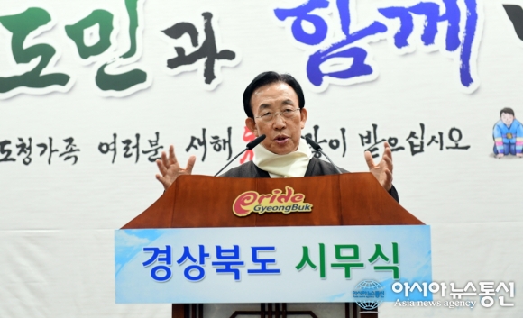 2일 경북도청 화백당에서 열린 2017년 시무식에서 김관용 경북도지사가 신년 인사를 하고 있다.(사진제공=경북도청) 경북도는 2일 정유년 새해를 맞아 안동 충혼탑에서 신년 참배를 시작으로 경북도청 화백당에서 시무식을 가졌다. 충혼탑 참배는 김관용 경북도지사, 고우현 경북도의회 부의장, 권영세 안동시장 등... 2017-01-02