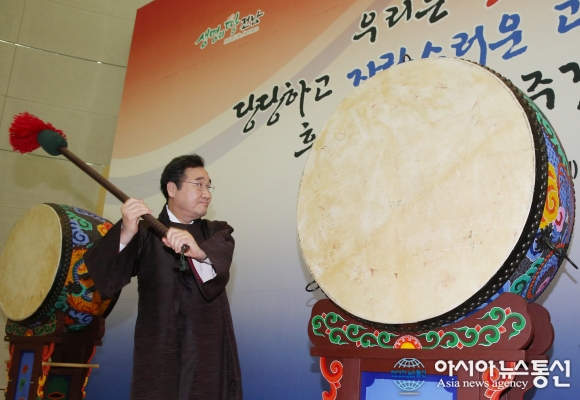 2일 이낙연 전남지사가 오전 도청 왕인실에서 열린 시무식에서 도민을 위한 온정 시책이 구석구석 퍼지기를 기원하는 대북을 두드리고 있다.(사진제공=전남도청) 이낙연 전남도지사는 2일 ‘어디에 가건 스스로 주인이 되라’는 뜻의 ‘수처작주(隨處作主)’를 새해 화두로 제... 2017-01-02
