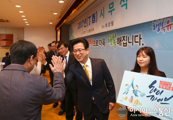 대전 유성구가 2일 구청 대강당에서 2017년 시무식을 개최한 가운데 허태정 유성구청장(가운데)을 비롯한 직원들이 한해의 힘찬 출발을 다짐하는 하이파이브를 하고 있다.(사진제공=유성구청) 대전 유성구는 2일 구청 대강당에서 허태정 유성구청장과 직원 300여 명이 참석한 가운데 이색 시... 2017-01-02