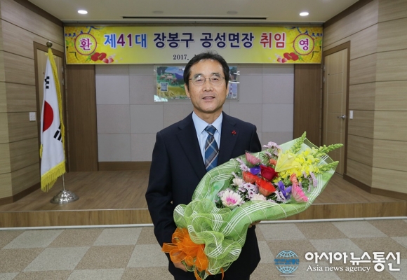 장봉구 경북 상주 공성면장이 2일 오전 열린 취임식에서 축하꽃다발을 받고 기뻐하고 있다./아시아뉴스통신=김철희 기자 장봉구 경북 상주 공성면장(58)이 2일 취임했다. 신임 장 면장은 취임사에서 "면 발전에 도움이 될 수 있는 일이라면 본청 실과소나 시장님께 떼를 쓰는 일도 마... 2017-01-02