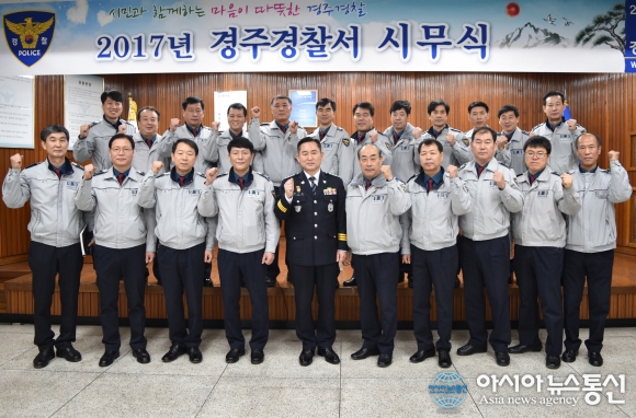 2일 경북 경주경찰서가 2017년 시무식을 개최한 후 함께 파이팅을 외치고 있다.(사진제공=경주경찰서) 경주경찰서(서장 양우철)는 2일 황성공원 충혼탑과 경주역 광장의 「故 이기태 경감 흉상」 참배를 시작으로 경찰서 3층 대회의실에서 서장, 각 과장, 계·팀장, 파출소장, 직원 등 150여... 2017-01-02