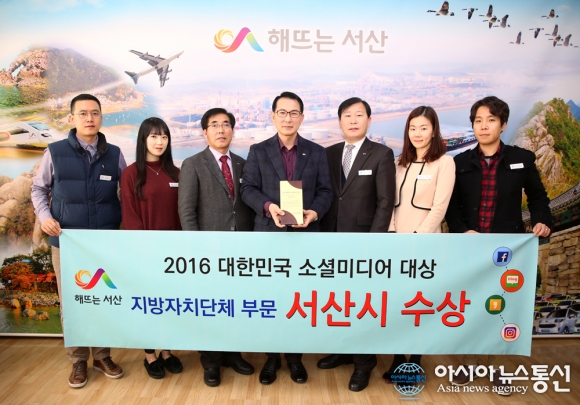 최근 서울 서초구 aT센터에서 개최된 2016 대한민국 소셜미디어 대상 시상식에서 지방자치단체 부문 대상을 수상한 서산시 이완섭 시장(가운데)과 시 관계자들이 기념촬영을 하고 있다. (사진제공=서산시청) 충남 서산시가 2년 연속 대한민국 소셜미디어 대상을 수상했다. 서산시는 최근 서... 2016-12-29