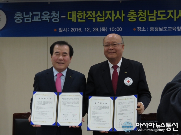 김지철 충남교육감(외쪽), 유창기 적십자 충남지사 회장(오른쪽).(사진제공=충남교육청) 충남도교육청은 29일 대한적십자사 충남도지사와 기부문화 확산과 봉사 및 나눔의 문화 활성화 지원을 위한 업무협약식을 가졌다. 대한적십자사 충남지사는 지난달 18일 개사식을 시작으로 충남 ... 2016-12-29