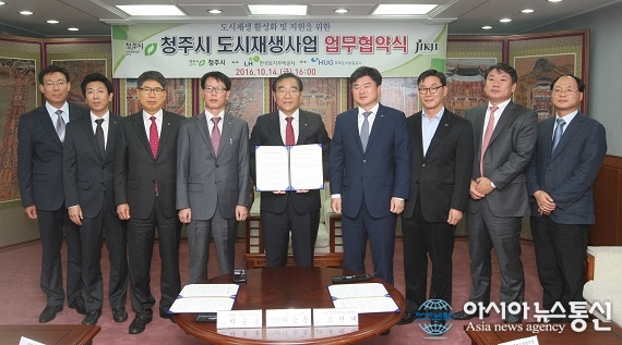 이승훈 청주시장(가운데)과 조현태 한국토지주택공사(LH) 행복주택본부장, 박종홍 주택도시보증공사(HUG) 기금사업본부장 등이 14일 청주시청 접견실에서 도시재생 활성화 및 지원을 위한 ‘도시재생사업 업무협약’을 체결한 후 기념촬영을 하고 있다.(사진제공=청주시청) 민간사업자... 2016-10-16