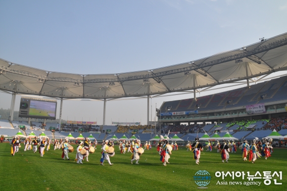 15일 인천 연수구 문학경기장에서 제52회 시민의날이 행사가 열린가운데 3개구 풍물단이 입장 하여공연을 하고 있다./아시아뉴스통신=양행복기자 인천시는 제52회 시민의 날을 맞아 오늘 문학월드컵경기장에서 '시민 대화합 한마당' 행사를 열렸다. 행사는 식전공연과 기념식, 시... 2016-10-15