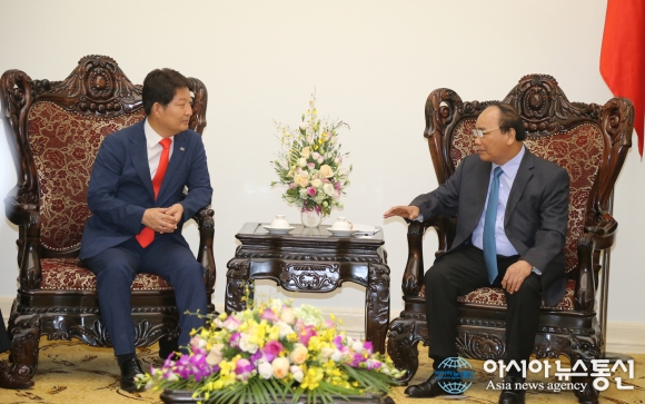 12일 오후 베트남 총리관저에서 권영진 대구시장(왼쪽)이 응웬 쑤엔 푹 베트남 총리와 환담하고 있다.(사진제공=대구시청) 대구시는 베트남을 공식방문 중인 권영진 대구시장이 베트남 총리로부터 '대구은행 호찌민지점' 개설을 적극 지원하겠다는 약속을 받았다고 13일 밝혔다. 권 시장은 지난 12일 오후 하... 2016-10-13