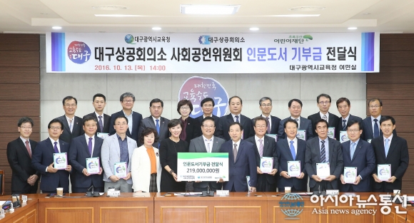 13일 대구시교육청 여민실에서 대구상공회의소 사회공헌위원회의 인문도서 기부금 전달식이 열리고 있다.(사진제공=대구시교육청) 대구상공회의소 사회공헌위원회(회장 김상태, ㈜평화발레오 회장)는 13일 대구시교육청에 인문도서 기부금 2억1900만원을 전달했다. 올해 기부금은 대구상... 2016-10-13