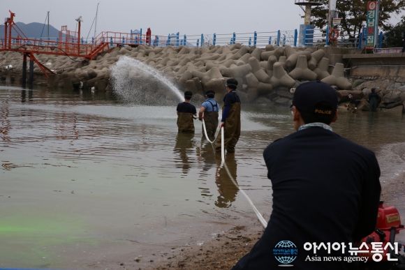 13일 창원해양경비안전서와 창원시 공동으로 마산합포구 진동면 광암 해변에서 ‘민?관 해안 방제 합동 훈련’에서 고압세척기를 이용한 방제작업 모습.(사진제공=창원해경) 창원해양경비안전서(서장 김영모)는 13일 마산합포구 진동면 광암 해변에서 창원시와 공동으로 ‘민?관 ... 2016-10-13