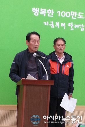 13일 청주시청 브리핑룸에서 청주시 남이면 양촌리 전원주택지 주민 대표들이 기자회견을 열고 이곳과 접한 곳에 자동차운전학원이 들어서는 것과 관련해 건축허가 승인 부당성을 주장하고 있다./아시아뉴스통신=김영재 기자 충북 청주시의 허가행정에서 최근 잇따라 주민들이 반발하는 ... 2016-10-13