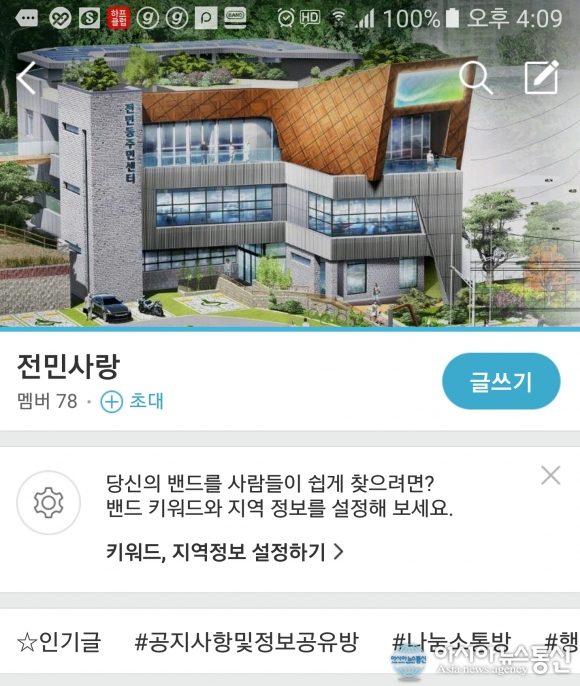 전민사랑 BAND 이미지.(사진제공=유성구청) 대전 유성구 전민동 주민센터(동장 전상배)는 정부3.0 시책에 부응하고 주민과 주민센터 간의 실시간 소통을 위해 SNS를 활용한 소통밴드 ‘전민사랑’을 개설했다고 13일 밝혔다. 전민동 주민센터는 지난... 2016-10-13