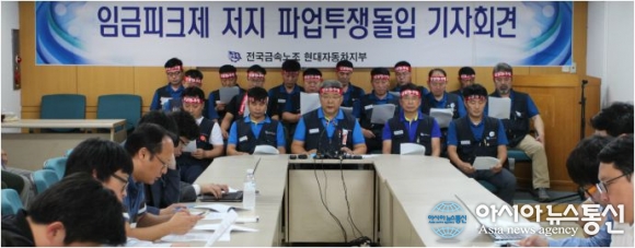 2015년, 현대자동차 노조 파업 개시 기자회견의 모습./아시아뉴스통신 DB 현대자동차 노사가 2차 잠정 합의안을 도출했다. 2차 잠정합의안은 기본급 7만 2000원 인상(기존 개인연금 1만원 기본급 전환 포함), 성과급 및 격려금 350%+330만원, 재래시장 상품권 50만원과 주식 10주 지급 등이다. 앞... 2016-10-13