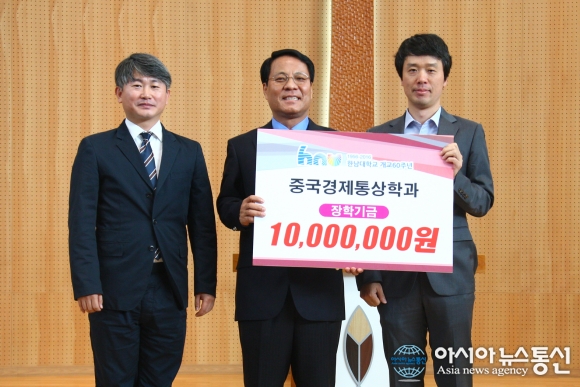 13일 한남대학교 중국경제통상학과 오대원(왼쪽), 정상은 교수(오른쪽)가 이덕훈 한남대 총장에게 장학기금 1000만원을 기탁하고 있는 모습.(사진제공=한남대학교) 개교 60주년을 맞은 한남대학교에 장학기금 기탁 릴레이가 이어지고 있다. 13일 한남대 ... 2016-10-13