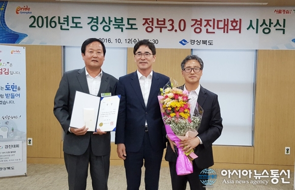 12일 전종태 의성군 기획실장(맨 왼쪽)이 도청 사림실에서 열린 시상식에서 김장주 도 행정부지사(가운데)로부터 은상을 수상하고 있다.(사진제공=의성군청) 경북 의성군(군수 김주수)은 12일 '2016 경상북도 정부3.0 경진대회'에서 은상을 수상했다. '정부3.0 우수사례 경진대회'... 2016-10-13