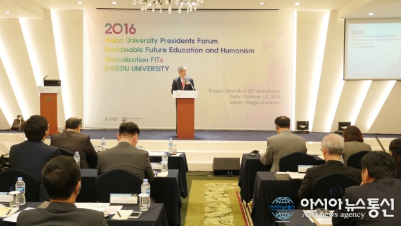 12일 대구 인터불고 호텔 카멜리아홀에서 열린 아시아 대학 총장 포럼에서 홍덕률 대구대 총장이 기조 강연을 하고 있다.(사진제공=대구대) 전 세계의 급변하는 교육 환경과 대학의 역할, 인간의 존엄성 문제에 대해 아시아 각국의 총장들이 만나 머리를 맞댔다. 대구대학교(총장 홍덕률)... 2016-10-13