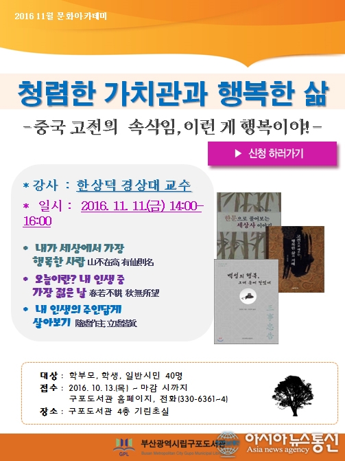 부산시립구포도서관은 오는 11월 11일 오후 2시부터 2시간동안 구포도서관에서 학생, 학부모, 시민 등 40명을 대상으로 ‘청렴한 가치관과 행복한 삶’ 특강을 실시한다.(사진제공=부산시교육청) 부산시립구포도서관(관장 손종호)은 오는 11월 11일 오후 2시부터 2시간동안 구포도서관... 2016-10-13