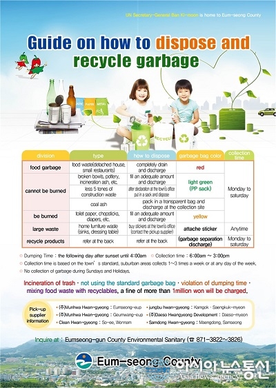 음성군 외국어 쓰레기 분리 안내문.(사진제공=음성군청) 충북 음성군이 외국인 거주자의 올바른 쓰레기 배출 문화정착을 위해 한글과 외국어로 표기한 안내문을 제작해 눈길을 끌고 있다. 13일 음성군에 따르면 음성군은 충북도내에서 가장 많은 외국인이 거주(9월말 기준 8444명)하고 있다... 2016-10-13